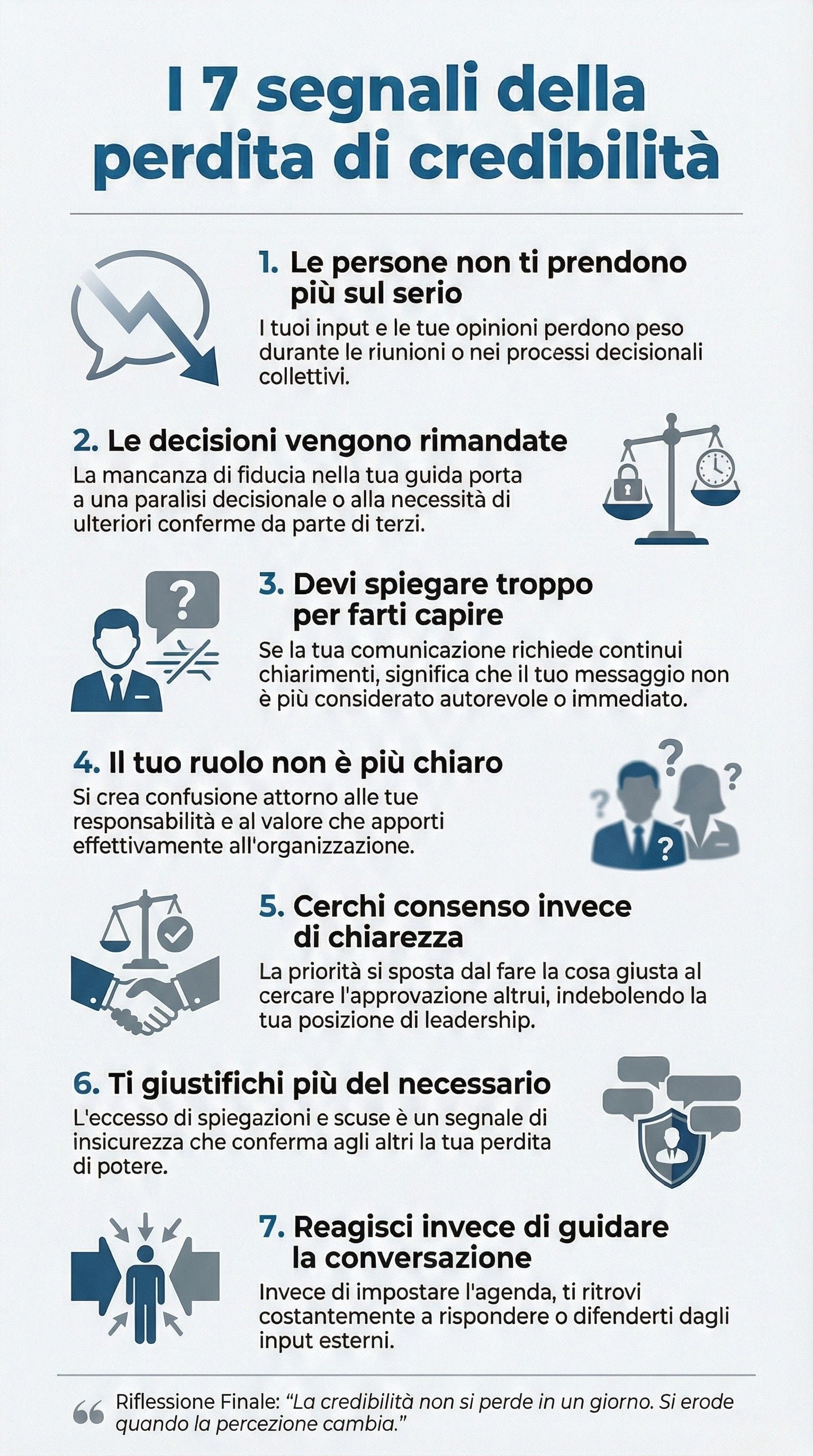 Questa infografica riassume i principali segnali di scarsa credibilità che emergono nella comunicazione professionale quando l’autorevolezza percepita si indebolisce, anche in presenza di competenza reale.